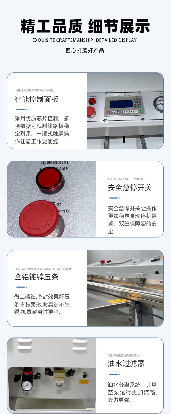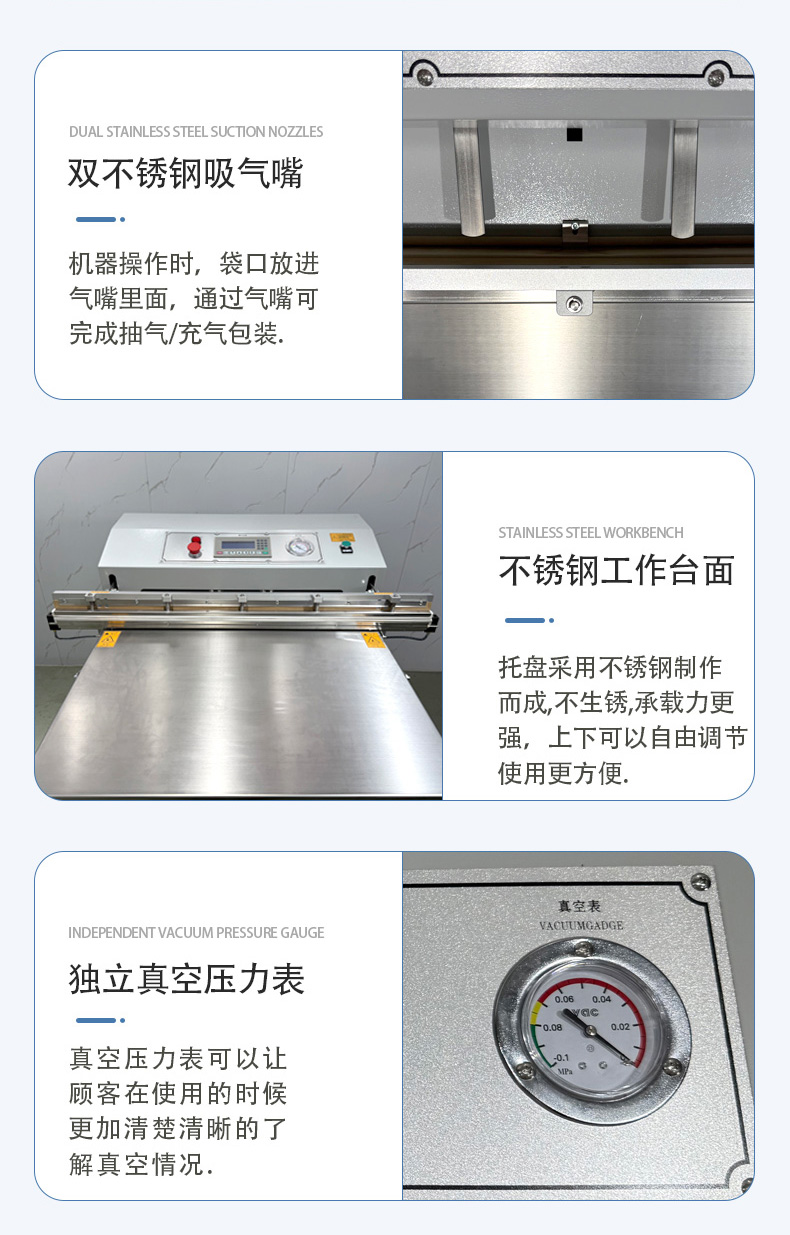 • 真空度與速度:確認(rèn)設(shè)備的極限真空度(通常 - 0.08~-0.095MPa 為宜)和包裝速度(每分鐘 1-3 件,視物品大小而定),避免因性能不足影響效率。