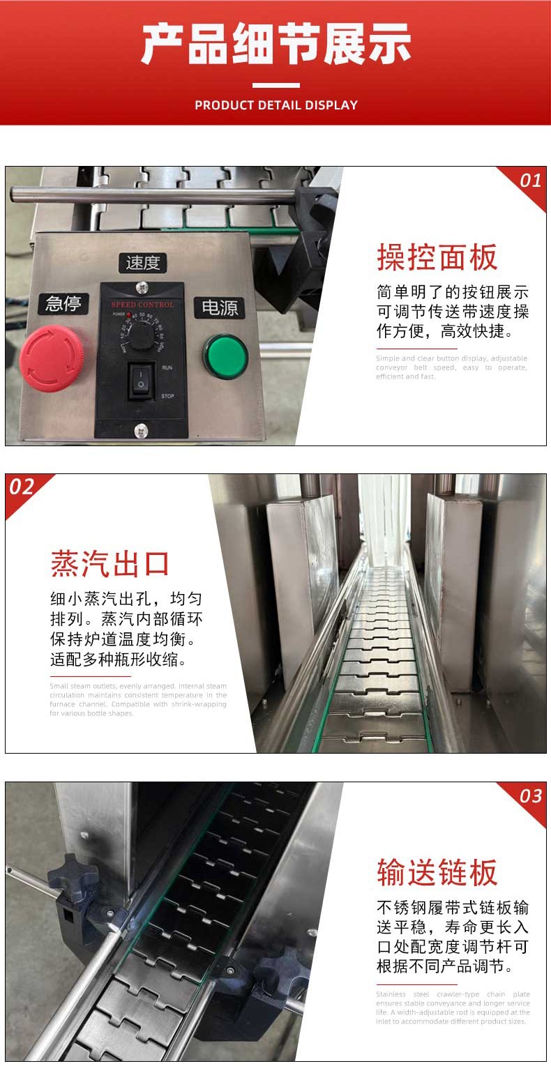 • 收縮通道:內部設有蒸汽噴射孔或噴嘴,通道長度與寬度根據產品尺寸可調,確保蒸汽均勻覆蓋。