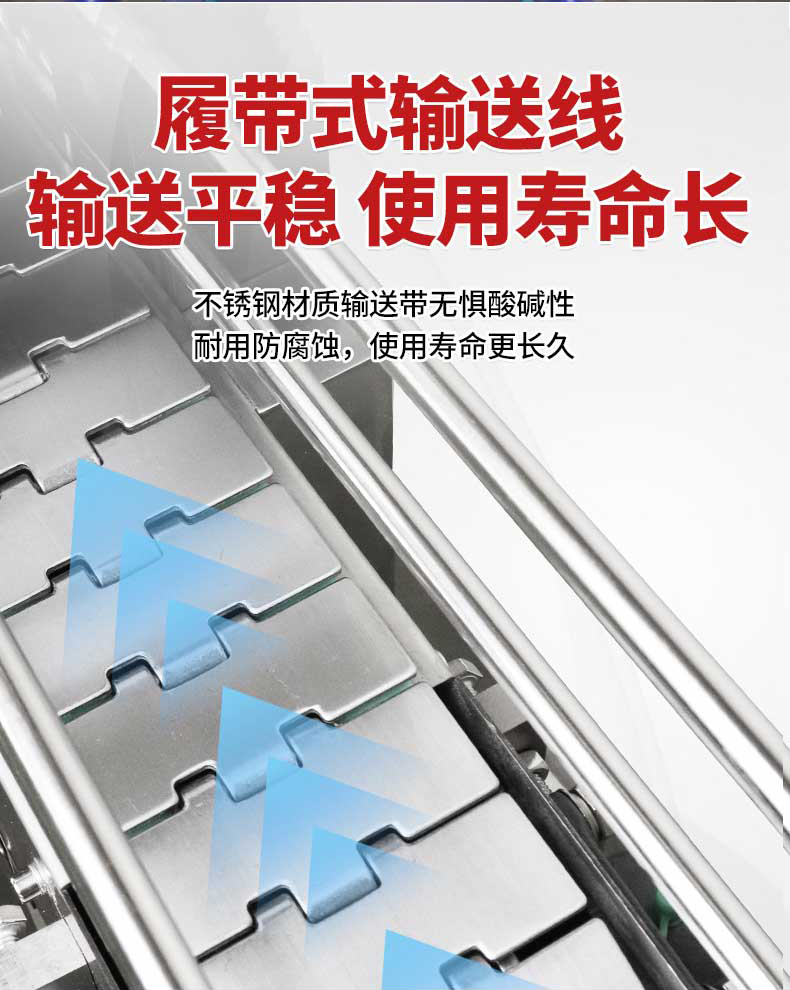 • 傳動系統(tǒng):采用網帶、鏈板或滾筒輸送產品,速度可變頻調節(jié),通常為 0.5-10m/min,以適應不同產能需求。