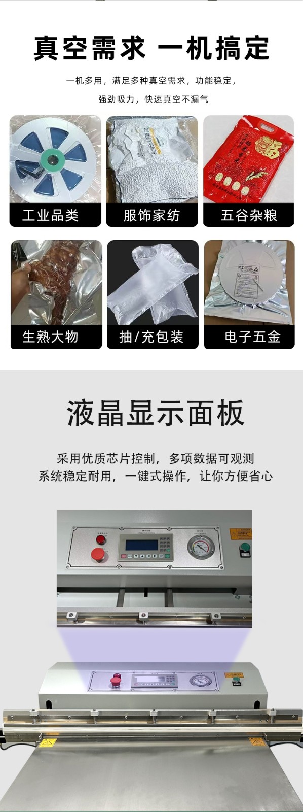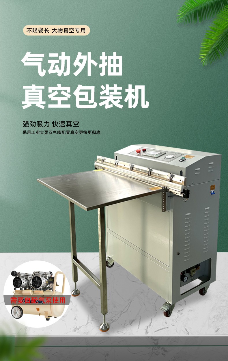 - 氣動外抽真空包裝機(jī)的抽氣口在包裝機(jī)外部,通過外接的抽氣管道對包裝袋進(jìn)行抽氣。而內(nèi)抽式真空包裝機(jī)是將包裝袋放入機(jī)器內(nèi)部的真空室進(jìn)行抽氣。外抽式的優(yōu)勢在于可以對不同尺寸和形狀的包裝袋進(jìn)行靈活抽氣,不受真空室大小的限制。例如,對于一些體積較大、形狀不規(guī)則的產(chǎn)品包裝,如大型的電子設(shè)備、長條形的工業(yè)零部件等,外抽式更能發(fā)揮其優(yōu)勢。內(nèi)抽式則更適合尺寸相對固定、批量較大的產(chǎn)品包裝,因為其內(nèi)部真空室的尺寸是固定的,對于形狀和大小差異較大的包裝可能不太方便。