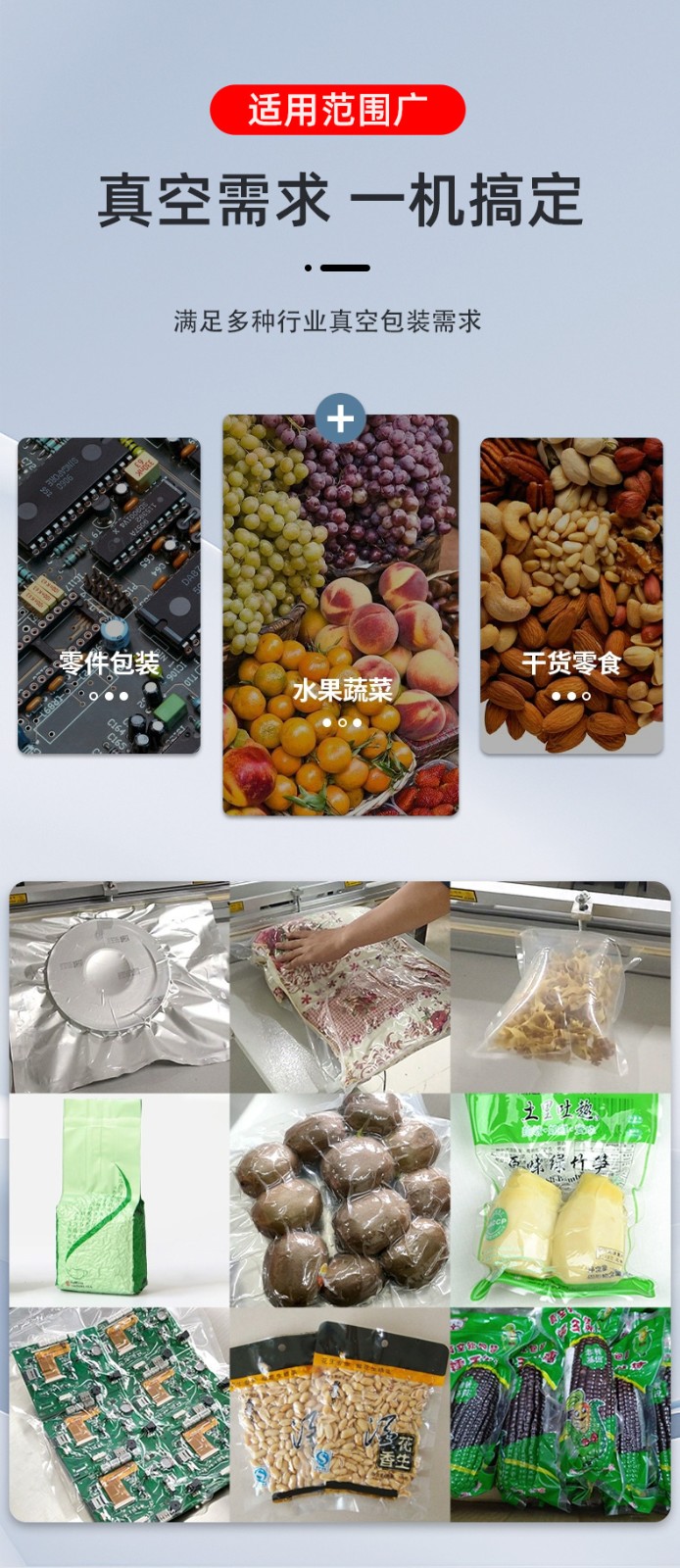 • 工業(yè)領(lǐng)域:大型機(jī)械零件、金屬構(gòu)件、整箱電子元件的真空包裝,防止運(yùn)輸中受潮、生銹。